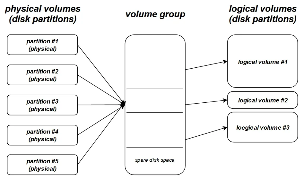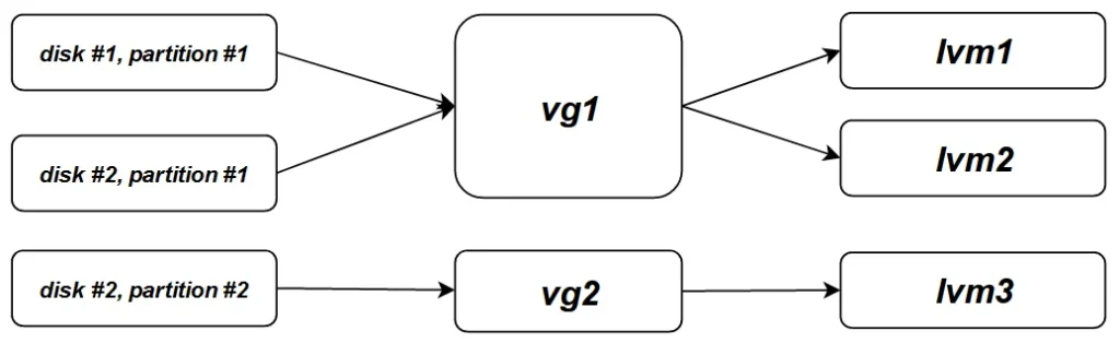 |-----------------------------------------| | LV #1 | LV #2 | LV #3 | Logical Volumes(LV) |---------------------------|-------------| | VG #1 | VG #2 | Volume Groups(VG) |---------------------------|-------------| | /dev/sdc1 | /dev/sdd1 | /dev/sdd2 | Physical Volumes(PV) |-----------------------------------------|