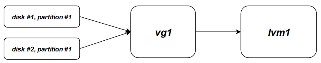 - Example 1: Two disks form one volume group which forms one single logical volume