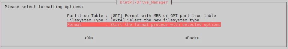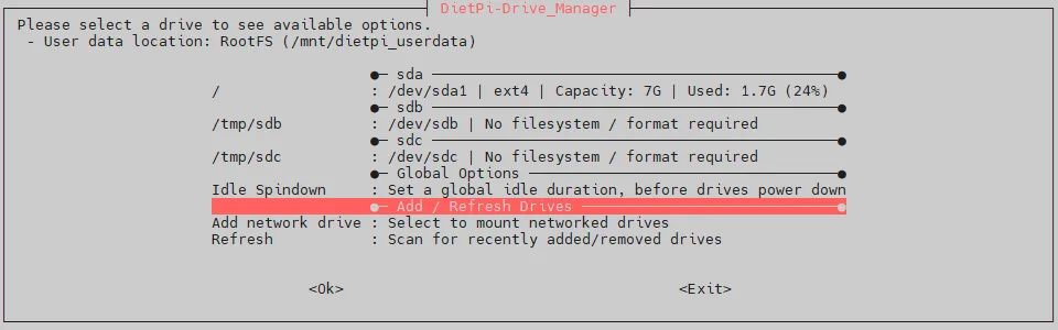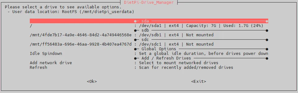 As next, the disk partitions are added using DietPi-Drive_Manager.
