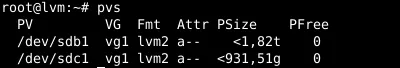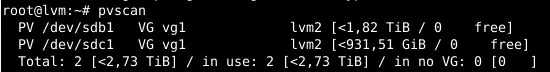 pvcreate /dev/sdb1 /dev/sdc1This leads to: