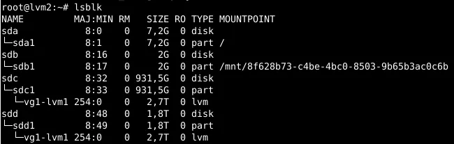 As can be seen, the size of /mnt/lvm1-storage is 2.7 TB which fits to the sum of the used 1.8 TB and 0.9 TB disk space (this e.g. could also be monitored via the command df -h).