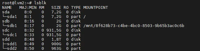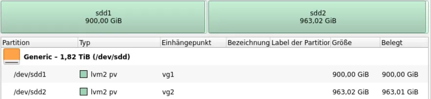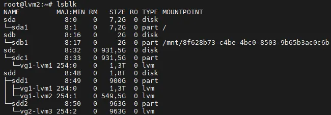 /dev/mapper/vg1-lvm1of 1.3TB/dev/mapper/vg1-lvm2of 550GB/dev/mapper/vg2-lvm3of 963GB