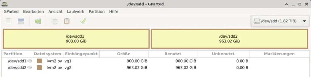 For the next example steps, a starting point of two disks (/dev/sdb resp. /dev/sdc) with different sizes (1.8 TB resp. 931,5 GB) having no partitions is assumed.
