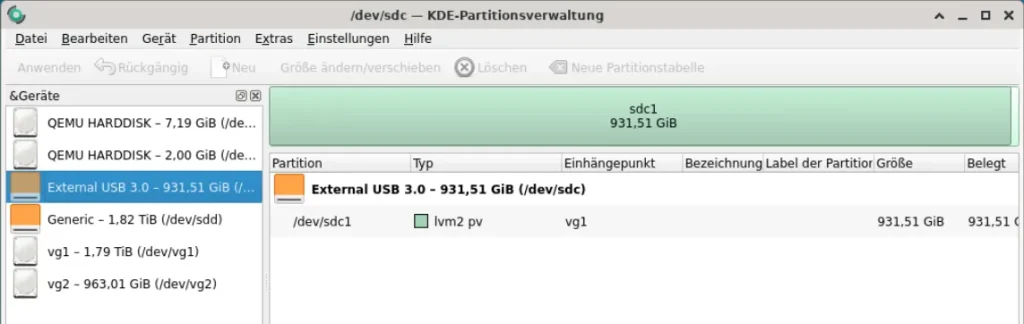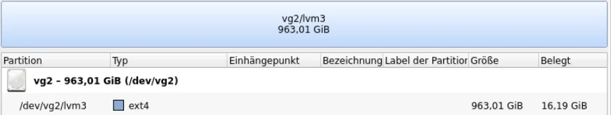apt install partitionmanagerThe logical volume support of KVPM is very good, the following screenshots show outputs from the environment of example 2.