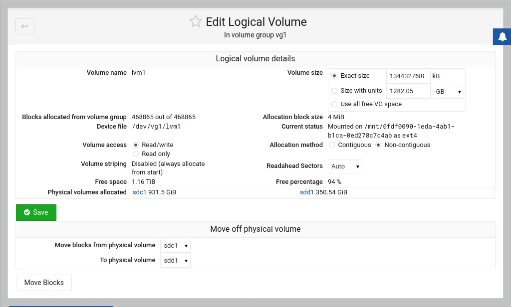 Mounting the formatted logical volume (virtual block device /dev/mapper/vg1-lvm1) can then be done via DietPi-Drive_Manager. This e.g. ends up in this state: