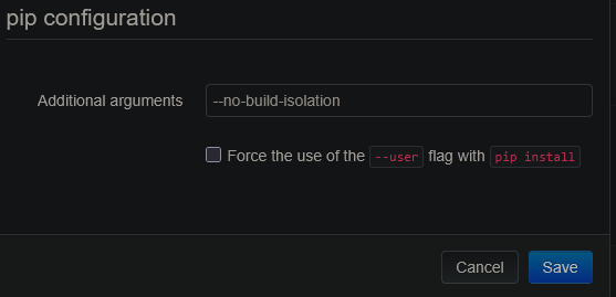 Unfortunately, if you wanna delete it via web panel, it also uses --no-build-isolation for the removal, but this will not work. So before deinstallation you need to clear the Additional arguments field. All of this hassle can be avoided when using a virtual enviroment, I will have a look into that, but not today