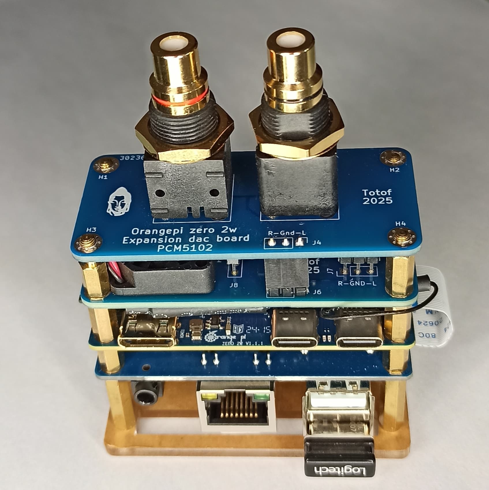 on the main board. It has a Wi-Fi and Bluetooth chip, a Wi-Fi antenna, and a 40-pin connector to which I added a PCB to install a PCM5102A DAC controlled via i2S and a fan to cool the main board.